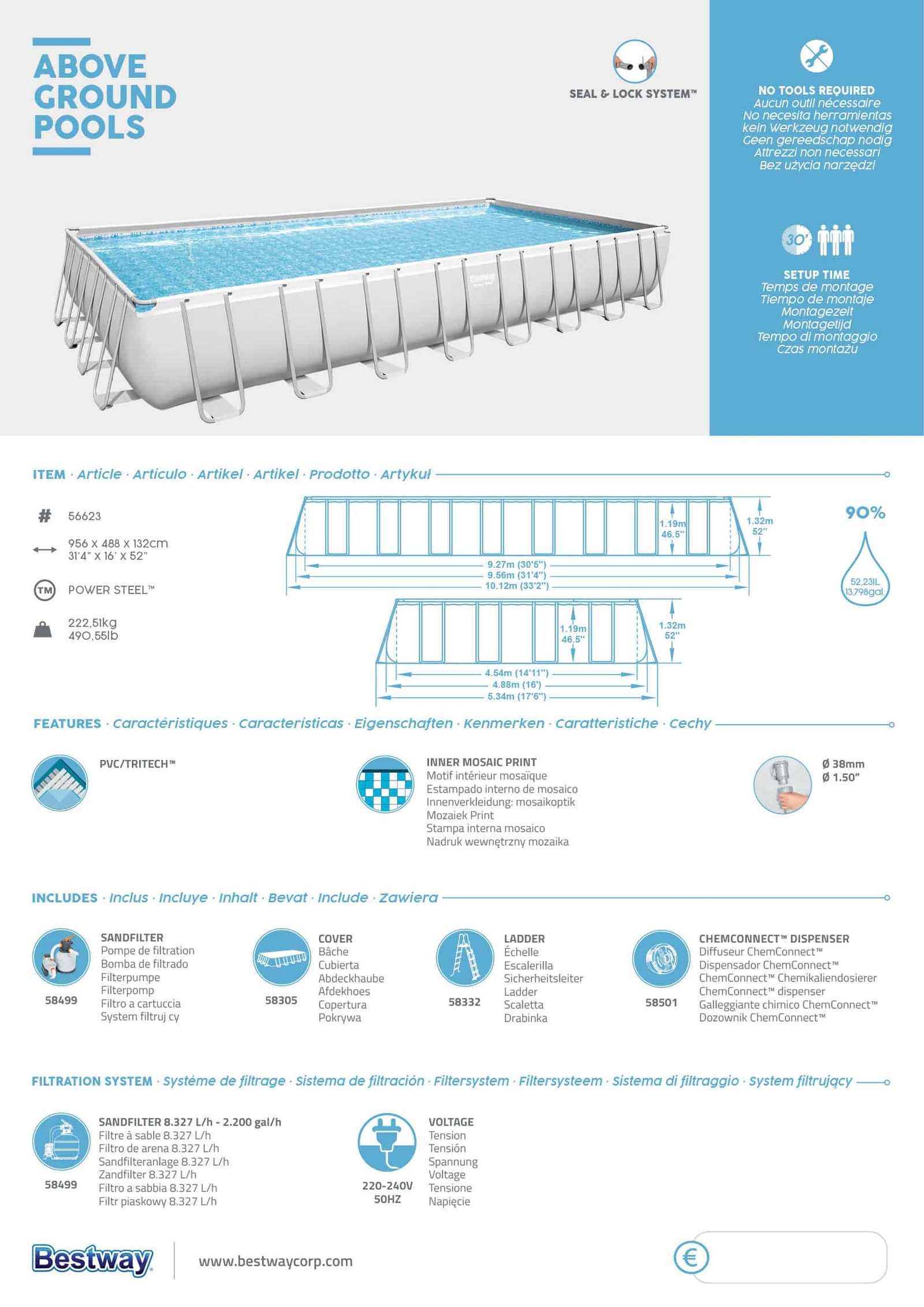 Bestway 56623 | Size 31.4 x 16.0 x 4.33 Ft | Power Steel Rectangular Metal Frame Portable Ready-Made Swimming Pool